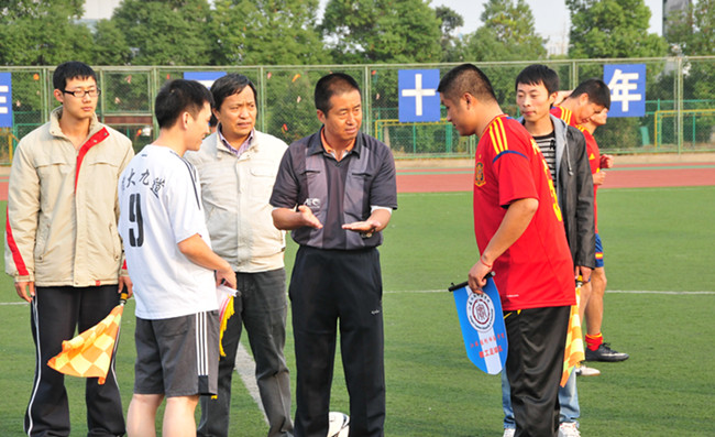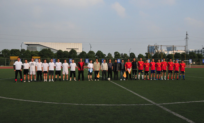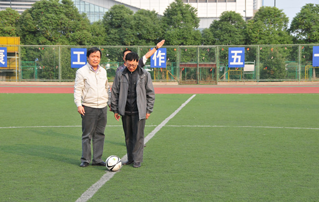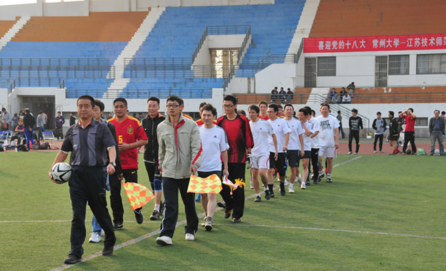 为迎接党的十八大胜利召开,11月2日下午,我校与江苏技术师范学院教工足球队在常州大学武进校区体育场举行足球友谊赛。江苏技术师范学院图书馆党总支书记朱广平、我校工会主席袁能出席并为比赛开球。