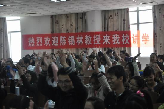 讲座围绕“整体健康人才”、“时代优秀学生”、“准职业化发展”以及“爱情事业双丰收”四方面展开。讲座中,陈教授与新生多次互动,并就同学关心的问题现场回答,同学们很快被陈锡林教授热情活泼的风格所吸引,现场气氛活跃。