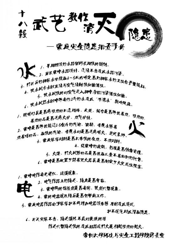 “安全查查看”活动中,环境与安全工程学院党团志愿者们赴永安花苑社区,与社区居民一起做家庭安全隐患排查工作,指导民众解决所存在的安全隐患。志愿者们还赠送社区居民《十八般武艺教你消灭隐患》家庭安全隐患排查手册,以便他们今后能及时避免并消除安全隐患,防患于未然。