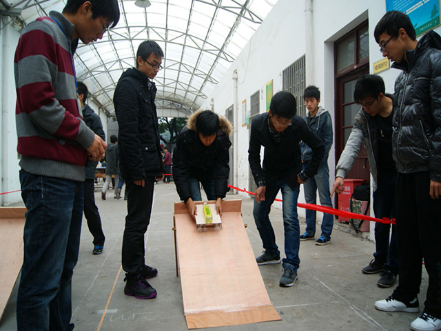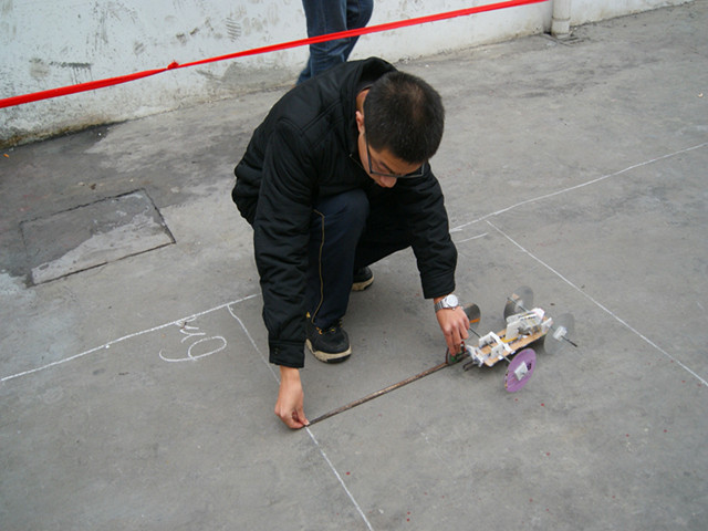 虽是小雨连绵,却依旧阻止不了同学们参加比赛的热情。参赛选手紧张有序的准备着,身旁同学也热心帮忙,出谋划策。参赛的小车形状多样,运用的原理多种多样,都凝聚着同学们的奇思妙想。赛场上井然有序,裁判客观公正,比赛精彩纷呈。一个以光盘和饼干瓶盖为车轮,看似简单破旧的小车,却凭借着二次加速的原理跑出了13.4米的最好成绩。