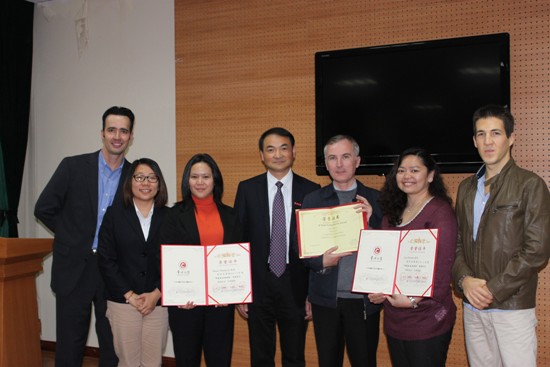 最后,陈群副校长为该院辛勤耕耘8余载的资深英籍外教Peter Court和今年喜获2012年度“十佳师德标兵特别奖”的菲籍外教Jing Duenas和Rezen Obstaculo颁奖。陈群副校长对他们多年来做出的贡献表示感谢,对他们的获奖表示祝贺。