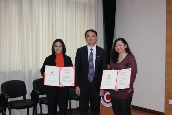 陈群副校长为外教Jing Duenas和Rezen Obstaculo颁奖