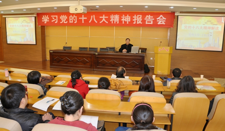 11月28日下午,外国语学院在图书馆报告厅举行学习党的十八大精神报告会,学院党政领导班子及全体教职员工参加了会议。