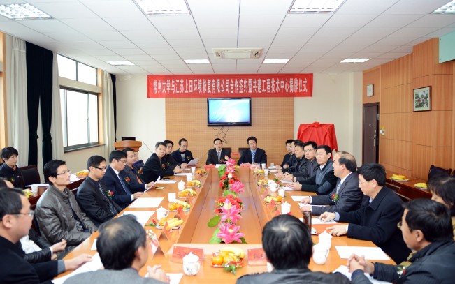 11月30日,我校与江苏上田环境修复有限公司合作签约暨共建工程技术中心揭牌仪式成功举行,双方将重点在土壤与地下水资源的修复技术上展开合作。常州市人大常委会副主任邵明与我校党委副书记孙小强为“常州大学上田环境修复工程技术中心”揭牌,江苏上田环境修复有限公司董事长唐晓声与我校科技处处长苏旭平分别代表校企双方在产学研合作协议上签字。常州市人民政府副秘书长彭峻,常州市侨务办公室主任张哲洁、副主任黄江,常州市环保局副局长李金玉、自然生态处副处长尹勇,武进区环保局局长张龙,钟楼区环保局局长刁学东,新北区环保局副局长高月峰,天宁区环保局副局长钱伟忠,新北区宣传部新闻处处长王忠良,江苏上田环境修复有限公司副总经理姚凯,我校科技处、研究生部、环境与安全工程学院相关负责人参加并见证合作签约暨揭牌仪式。我校环境与安全工程学院院长李定龙主持仪式。