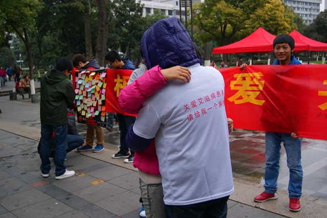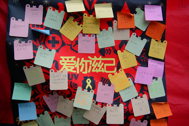 本次活动由该院团委组织,以普及艾滋病知识为主,通过现场的宣传来增加人们对艾滋病的认识和关注。路上的行人被同学们的热情打动,积极参加活动,并为艾滋病患者写下祝福,给关心艾滋病患者的同学们一个拥抱送上自己的爱心。同学们也将自己亲手做的红丝带送给参与本次活动的行人们。