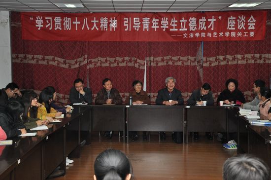 为学习贯彻落实十八大报告精神,关心关爱下一代健康成长,引导广大青年学生立德成才,进一步推进文法学院与艺术学院关工委工作的开展。近日,文法学院与艺术学院关工委召开“学习贯彻十八大精神 引导青年学生立德成才”专题座谈会,座谈会邀请了我校关工委张桂华副主任、朱净之老师、任衣伟老师和周军红老师参加,文法学院与艺术学院关工委全体成员以及学生代表参加了此次座谈会。