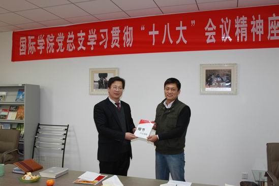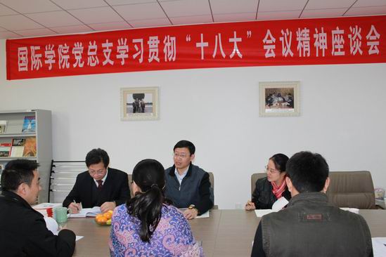 近日,国际学院在东区512会议室组织召开学习贯彻党的十八大精神座谈会。校党委副书记孙小强出席会议并讲话,学院党政领导班子成员、党总支全体成员参加了座谈。院党总支书记杨琳主持学习会议。