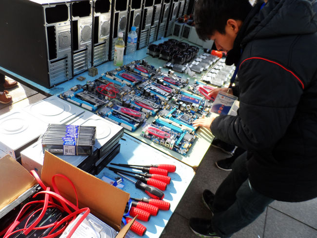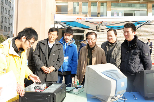 比赛正式开始前由专家评委进行装机演示,并讲解装机过程中的注意事项,娴熟的操作技术让在场的观众啧啧赞叹。本次比赛共吸引了来自校内143名同学的报名参与,经过笔试选拔共有30名同学冲进决赛,比赛共分6组,每组比赛限时20分钟,选手最终的成绩由装机时间和装机分数两部分叠加构成,同等分数以时间短取胜。尽管天气寒冷,比赛依然吸引了不少计算机爱好者的驻足;选手们镇定自若,信心满满。经过角逐,计算机112 班陈瑶(时间9分50秒 最终得分108分)取得了第一名,电子111班薛凤超(时间11分钟,最终得分104分)第二名。