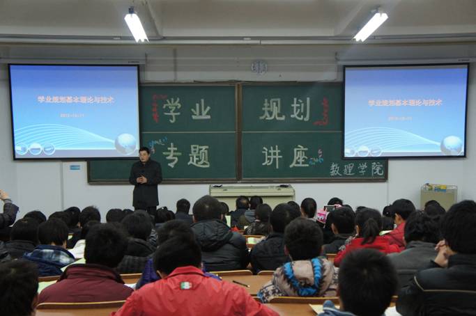 为了积极引导2012级新生合理规划自己的大学生活,帮助大学生尽早地明确自己的方向与目标,找准自己的定位,12月11日晚,数理学院邀请了学生工作处袁志华副处长在W10阶为全体2012级新生举行了一场学业规划专题讲座,2012级班导师和学工办全体辅导员也参加了讲座。