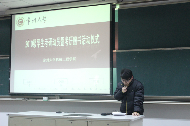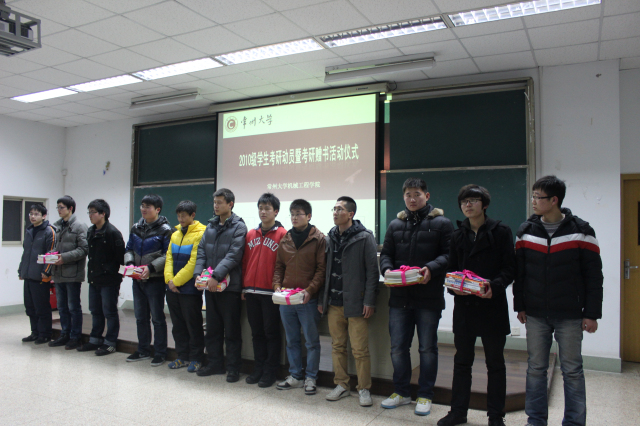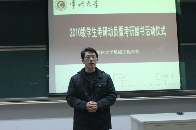 为促使2010级学生提前把握考研形势,树立考研目标,1月8日晚,机械工程学院2010级考研动员动员大会暨考研赠书仪式在南一阶顺利举行。院党委书记袁惠新、副书记吴荷平、2009级考研学生代表以及2010级全体学生参加了本次动员大会。