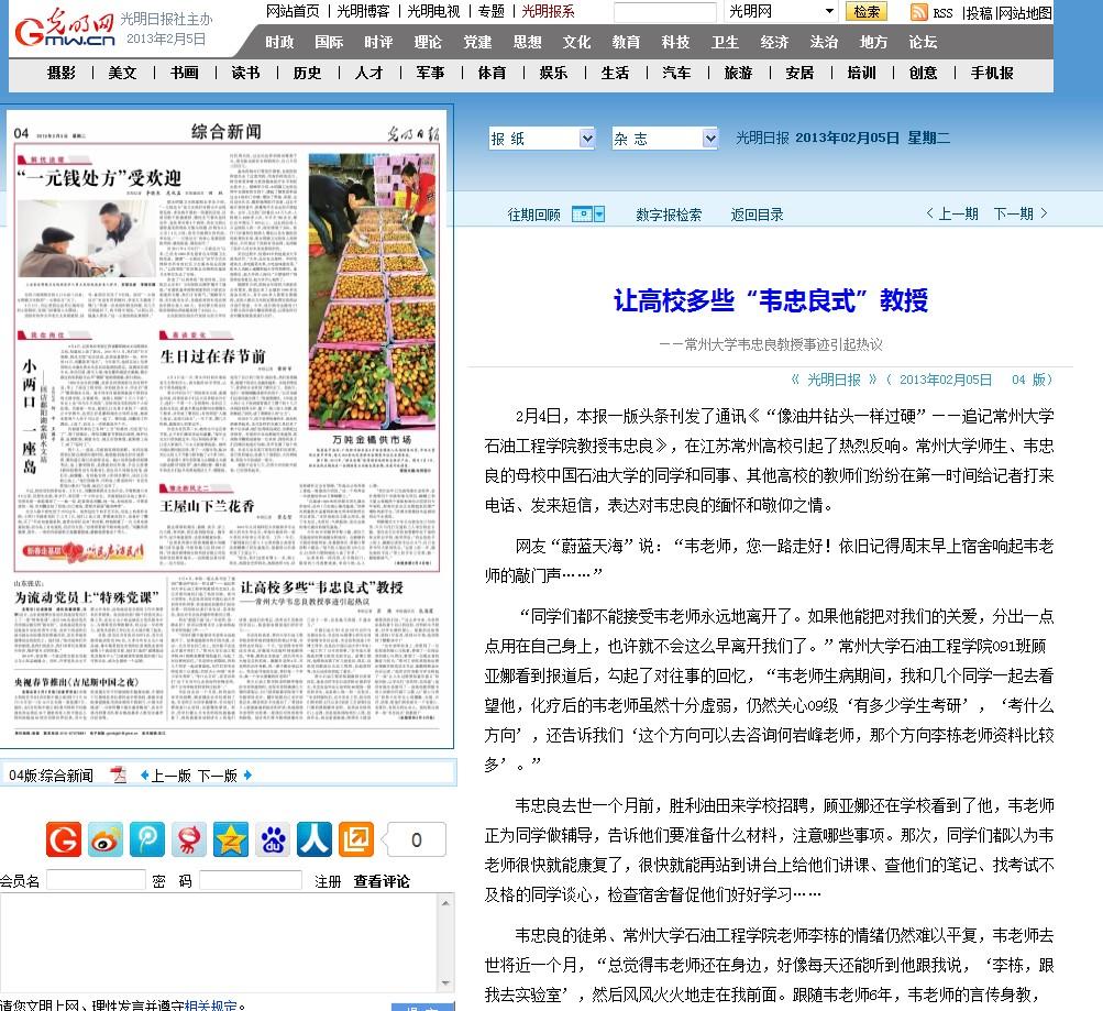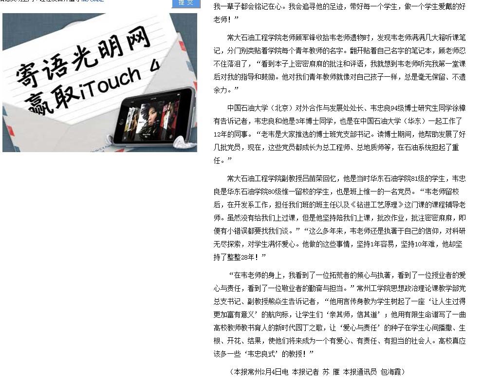 2月4日,本报一版头条刊发了通讯《“像油井钻头一样过硬”——追记常州大学石油工程学院教授韦忠良》,在江苏常州高校引起了热烈反响。常州大学师生、韦忠良的母校中国石油大学的同学和同事、其他高校的教师们纷纷在第一时间给记者打来电话、发来短信,表达对韦忠良的缅怀和敬仰之情。