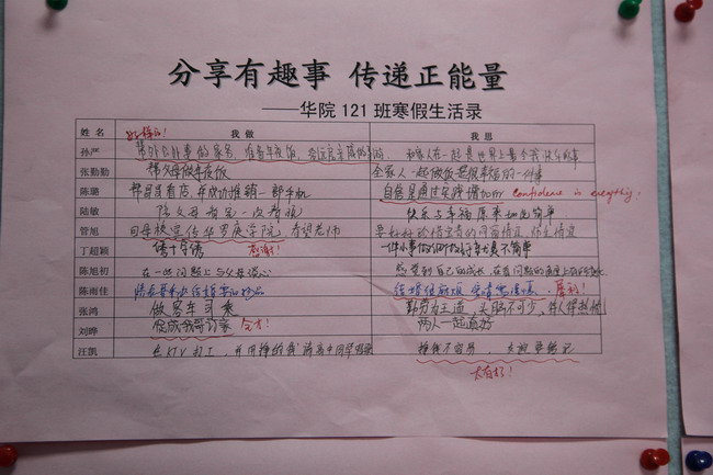 在交流会上,同学们讲述了各自在寒假里所做的一件有意义的事,并分享了他们从中获得的感悟。同日下午,开展了综合素质拓展活动,同学们在互动中培养协作意识与合作精神。根据学院的要求,同学们充分利用寒假时间多读书,在读书报告会上,大家用英语交流各自读书心得,既锻炼了英语表达能力,又拓宽了视野。24日上午,在学生学业规划与反思和学习经验交流会,副院长陈颖针对学业规划的意义与方法做了详细的介绍和指导,为大家确立未来的发展目标提供有益帮助。学习经验交流会上,大家踊跃发言,探讨各自的学习经验与困惑,互相启迪,共同进步。