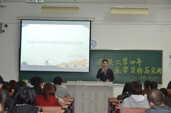 在“文明成人 健康成才 和谐成功”理念的指导下,艺术学院积极开展“学业规划”系列教育活动。为更好地为大一、大二的美术学专业同学们服务,提高学生的专业素养与绘画能力,艺术学院于近日在W1507举办了“学长浅谈大学四年绘画学习经历见闻”的朋辈学业辅导讲座。本次讲座邀请到该院艺设091孔小云主讲,其两幅作品在2012年入选中国美术学院主办的《跨界·综合-两岸四地艺术院校学生优秀作品展》并载入《跨界·综合-优秀设计作品集》,辅导员老师以及艺术学院部分同学参加了本次活动。