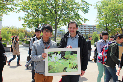 艺术学院为此次义卖提供了70多件形式多样、风格迥异的学生原创作品,包括学生亲手制作的陶艺作品、油画、国画、装饰画以及手工饰品,每一件作品都凝聚了同学们的辛勤汗水,将常大学子的暖暖爱心融于精心的设计创作中。义卖现场许多老师和同学纷纷前来观看购买心仪作品,副校长陈群购得了由王雨楠同学创作的油画《夜中的世界》,捐献了自己的一份爱心,赢得了在场师生的声声赞赏。同时,外国友人也慷慨解囊,化工学院的Myoslav Vysotsky教授购买了秦天同学的水粉画,并与其合影,引爆了全场高潮。