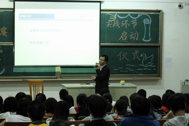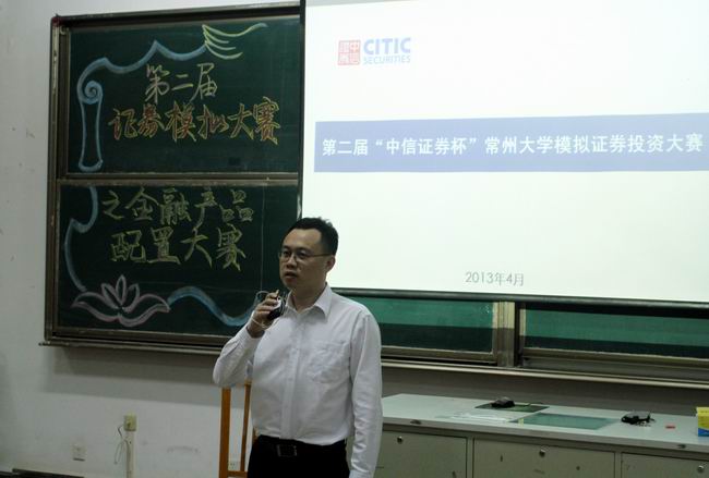 仪式上,中信证券常州营业部归旋总经理以及耿剑总监分别讲话,介绍了金融知识以及大赛实践环节相关事宜,指出本次活动旨在培养学生实践动手能力,发现金融人才,并对活动予以衷心祝福与美好期望。耿剑总监详细介绍了大赛时间环节的具体安排及要求,鼓励经过前期理论学习考试的同学在实践环节取得更好的成绩。