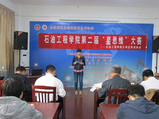 5月10日中午,由石油工程学院科协举办的第二届“星思维”大赛在院三楼会议室举行,来自该院各年级的15组选手参加比赛。大赛评委团由石油工程学院党委书记张炳生、副院长何岩峰、关工委肖立川老师、储运系主任赵会军老师、石工系主任吕苗荣老师、建环系主任郭强老师、学工办韩一松老师组成。