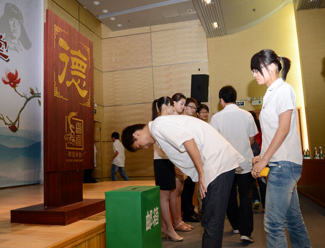 "德"字牌前鞠躬