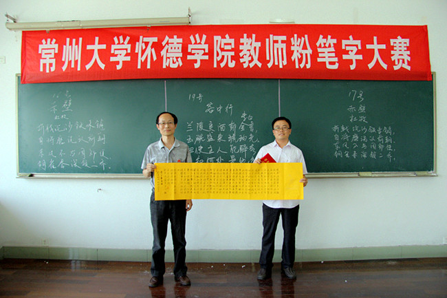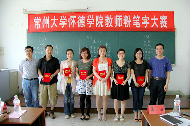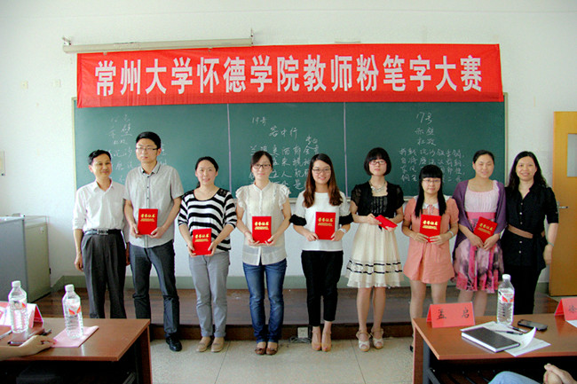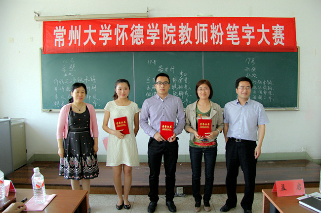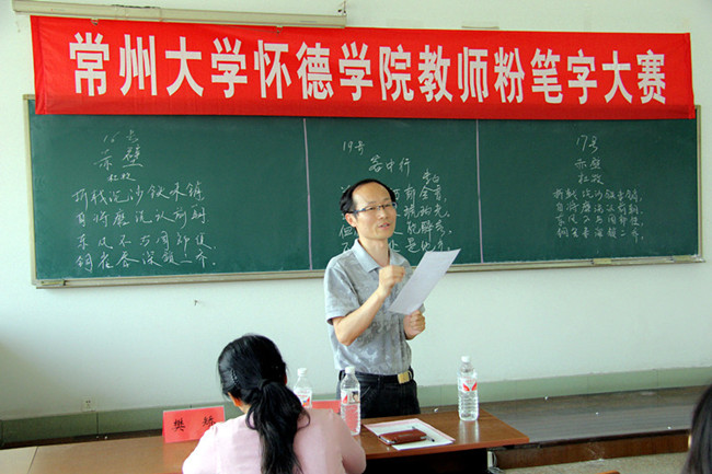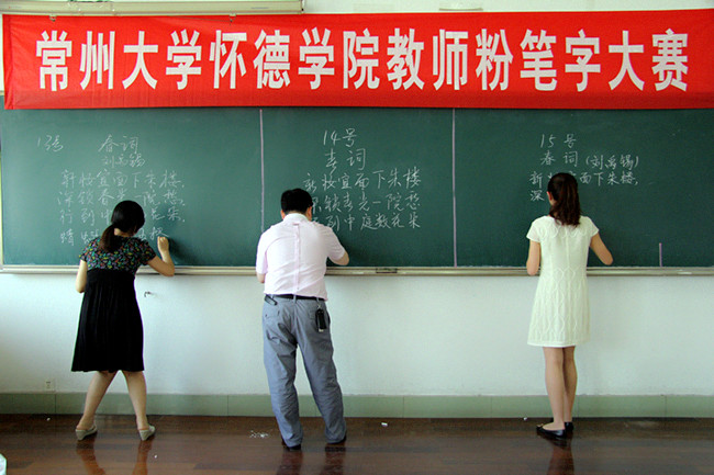 为扎实青年教师课堂教学基本功,怀德学院在举办“硬笔书法与板书艺术”讲座之后,于5月14日下午举办了青年教师粉笔字大赛。学院特别邀请江苏理工学院教育学院院长助理、江苏省书法家协会会员邢敏村老师为本次比赛评委会组长,江苏理工学院教务处副处长、语委办主任樊矫老师,常州太平洋有限公司总经理、常州轻工职业技术学院艺术设计专家咨询委员会成员汪稚农老师,校教学质量监控中心主任、教务处副处长徐明华老师,怀德学院执行院长孟启老师任本次比赛评委。