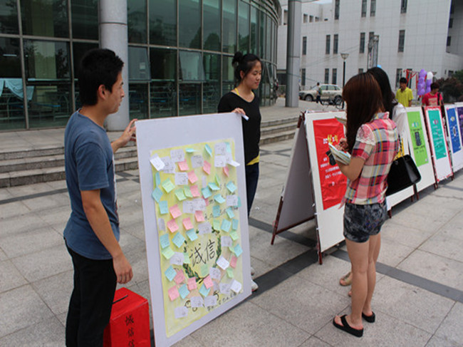 此次系列活动围绕“诚信守信、立德树人”展开,深入挖掘学生资助过程中的育人功能。组织大一学生观看了“信义兄弟”的感人影片,同学们纷纷通过撰写观后感的形式来表达“存诚心、赢信誉”的感悟;在水月广场举办了以“诚信为主题”的征文投稿与宣言展示活动,现场气氛热烈,同学们踊跃参与,充分展现了当代大学生“诚实做事、信用为人”的决心与信心;学院还通过QQ、人人网、微博等网络平台将诚信教育融入同学们生活的方方面面。