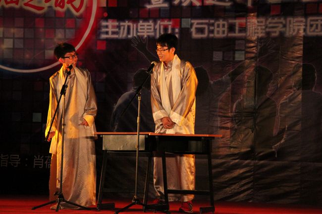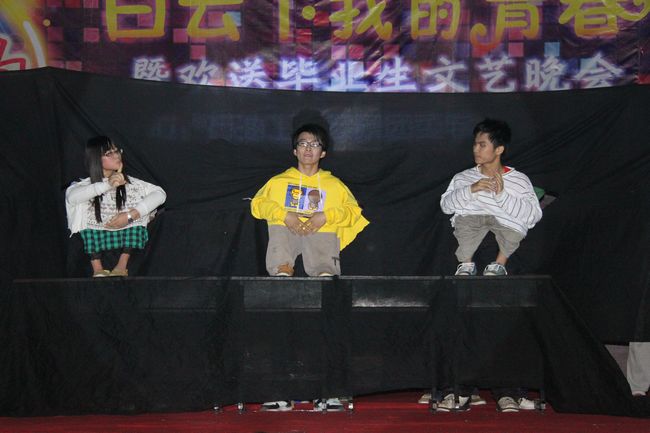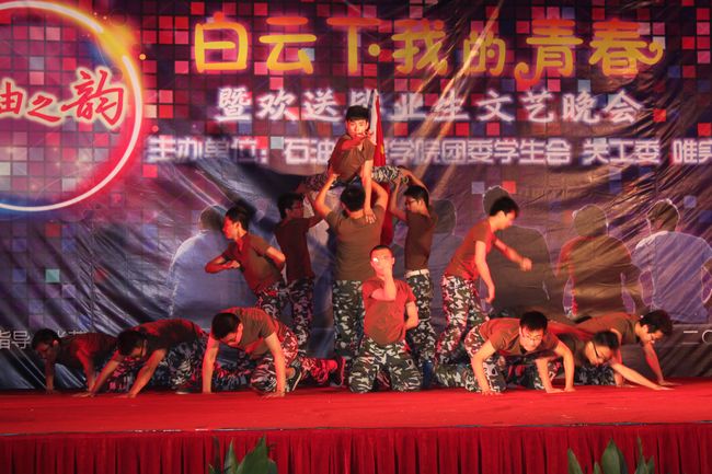 随后,由石工121带来的洋溢着青春活力的开场集体舞《Together》,舞出了同学们在大学生活中团结互助的情谊。接下来的节目异彩纷呈,令人目不暇接,饱含深情的歌曲串烧,奇幻生动的魔术表演,热情奔放的舞蹈,风趣幽默的相声…… 其中由我院学生会带来皮影戏《时光影院》,用光影再现中国共产党成立以来的一段段历史,营造出深刻的时代变迁之感;由储运091班赵丽娜等带来的舞蹈《行云流水》把优美的舞蹈和中国功夫结合起来,给观众带来了柔与刚的视觉冲击;储运113班同学的军体舞《红蓝军》再现了当代中国军人的飒爽英姿;由心韵演绎社带来的小品《留个念想》和歌曲《小合唱》,演绎了朋友之间的真实感情,唱出了对大学生活的深切留恋。最后,院唯实学社的一曲《我的未来不是梦》,化离别的感伤为奋进的力量,催动着毕业生们为自己的梦想而不断奋斗。