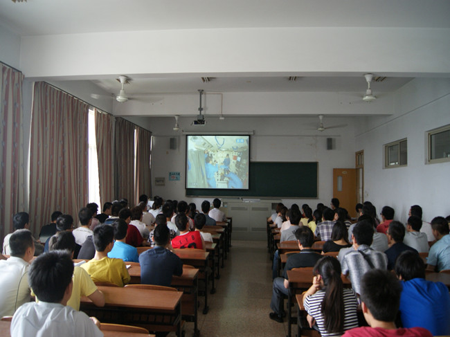6月20日上午10点整,我院党委书记袁惠新,党委副书记吴荷平,学工办全体老师以及学生党员与本科生、研究生各班级学生代表100余人观看中国航天史上首次太空授课直播视频。