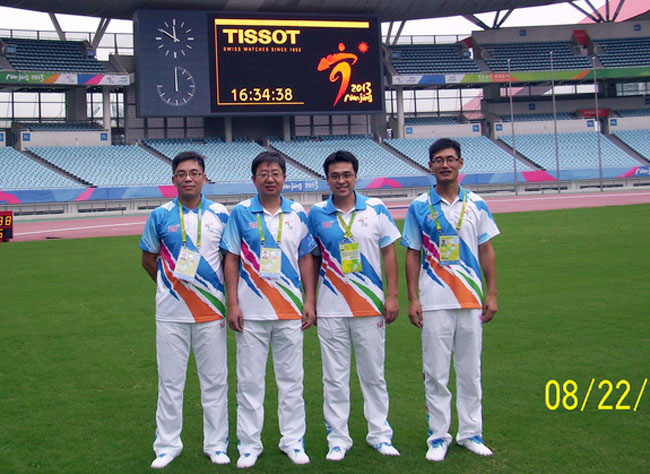 (左起)郭建强、徐勤儿、咸东进、于楼成老师参加田径项目裁判工作