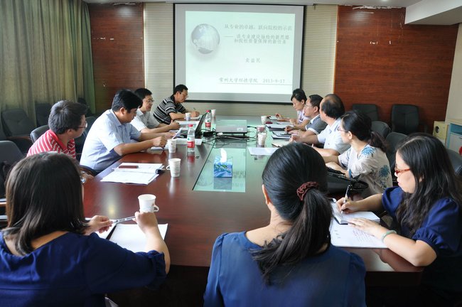 袁益民副院长肯定了怀德学院在专业建设抽检工作中所做出的努力,就英语专业抽检材料的审核意见进行反馈。袁益民副院长为与会人员作了《从专业的卓越,跃向院校的示范——谈专业建设抽检的新思路和院校质量保障的新任务》专题讲座。讲座中,他解读了“高教三十条”的新精神和本科教学评估新方案;展望专业建设抽检的变革和院校教学评估试点方案;介绍评估改革视野下的高校内部质量保障基本框架。他重点强调,“师生的满意度高,才是对学校最大的肯定”,省教育评估院将进一步完善评估体系以更好地为学校发展和师生服务。
