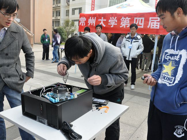 11月27日下午,由教务处、校团委主办,信息科学与工程学院承办的第四届大学生电子信息技能大赛之计算机装机大赛在图书馆前广场成功举办。校关工委老师王正洪,教务处副处长徐明华、校团委书记牟静、信息学院党委书记柳铭、副院长孙霓刚,党委副书记储志新、院办主任许淮、常州大学电脑120指导老师何可人、常州大学电脑120创始人张景洲应邀出席并担任此次大赛的嘉宾。