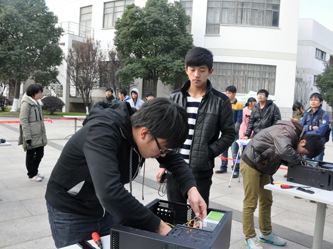 比赛正式开始前由专家评委进行装机演示,并讲解装机过程中的注意事项,娴熟的操作技术让在场的观众啧啧赞叹。本次比赛共吸引了来自校内143名同学的报名参与,经过笔试选拔共有40名同学冲进决赛,比赛共分5组,每组比赛限时20分钟,选手最终的成绩由装机时间和装机分数两部分叠加构成,同等分数以时间短取胜。尽管天气寒冷,比赛依然吸引了不少计算机爱好者的驻足,选手们镇定自若,信心满满。经过角逐,自动化121班周文涛(时间6分28秒,最终得分94.4分)夺得本次比赛第一名,信科(教改)131班朱骋(时间为7分38秒,最终得分94分)取得本次比赛第二名。