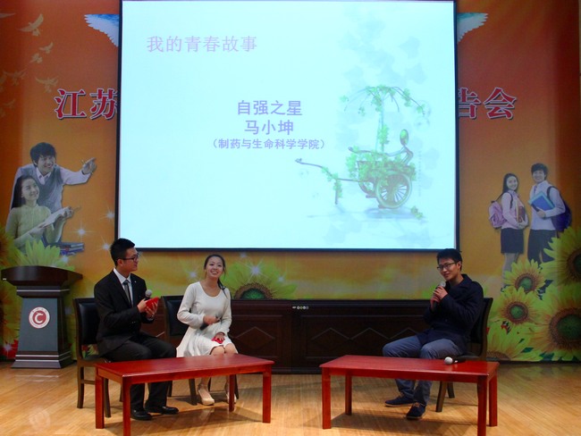 本次报告会的主角是来自同学们身边的青春之星。第一个上台的是志愿之星——来自我校石油工程学院的蒲公英团队。团队的四位代表讲述了他们四年来在雪堰镇新康村义务支教的故事。他们是一支积极向上的团队,一直坚持完成支教活动,给留守儿童带去了知识和爱。第二位主讲人是自强之星——来自我校制药与生命科学学院的大四学生马小坤,他从“常大好人”、“常州好人”、到“江苏好人”、“中国好人”,还获得了全国大学生自强之星的提名奖。马小坤讲述了他的自主创业历程、为何把父母从农村老家接来常州一起生活、如何处理好学业、创业、生活的关系。他传承着孝道美德,更做到了真正的独立。第三个出场是文体之星——来自常州信息职业技术学院大学生艺术团的代表。他们是一支“久经沙场”的团队,他们在艺术的道路上已经取得了些许成功,也和外国艺术团同台合作过。通过努力和拼搏他们获得了成功!最后上场的是科技之星——来自我校石油化工学院的涅风团队,他们在第十三届“挑战杯”全国大学生课外学术科技作品竞赛中获得二等奖,代表们讲述了个人的奋斗历程、职业规划以及如何进行团队合作等!每个青春之星都有一段激励人心的故事。他们都是普通的同学,只因不畏艰难、勇往直前,才获得成功。
