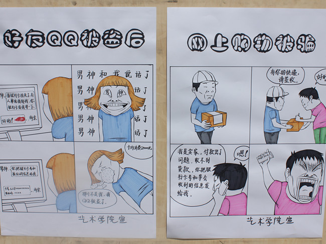 为有效遏制高校网络电信诈骗案件高发态势,切实提高师生们的自防意识和自防能力,近日,艺术学院以“四个一活动”(人手一份案例集、一次学生骨干培训、一课主题班会、一套漫画展板)”为实施载体,采用丰富的艺术表现形式和多样化的教育手段,全力推进高校防范网络电信诈骗宣传教育活动。