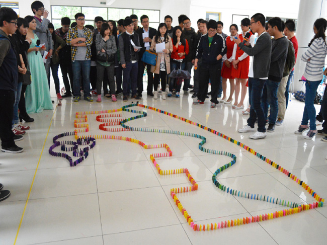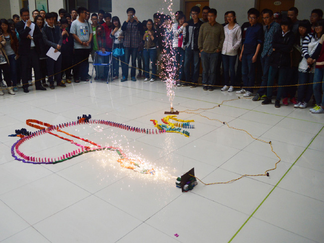 10组队伍的参赛作品都非常具有创意,精妙绝伦。材料学院制作的“印象中国”采用了杠杆和沙漏原理组合的方法作为启动器,着实为一大亮点;外语学院的青奥会吉祥物结合了花灯的形式,也很是出彩;社联的“龙”也非常出色,骨牌推倒后,一条喷“火”的龙映入眼帘……当然,还有“长城”,“兔爷”等也很精彩。最后,在评委老师的打分以及现场观众的投票下,材料学院代表队获得了一等奖。