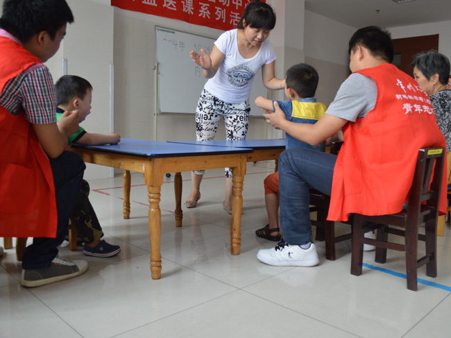 尽管天气炎热,二十多位志愿者一到康复中心,就立刻投入到志愿服务中,积极配合康复中心老师对自闭症儿童进行一对一的辅助指导。志愿者们耐心陪同小朋友们上课、做游戏、吃饭及参加康复训练。尽管大多数志愿者并没有和小孩子共处的经验,但凭着一颗颗炽热的爱心,他们很好地完成了照顾自闭症儿童的任务。