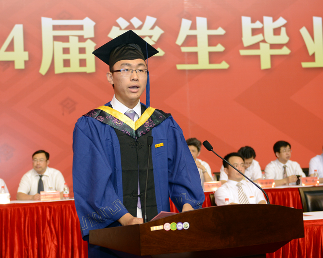 校党委书记史国栋教授发表了热情洋溢的讲话,他代表学校向所有毕业生表示了最诚挚的祝贺,向所有倾尽心血养育和培育毕业生的家长、老师们表示了最真挚的感谢。他以“责任”为主题,把“责尽心安”作为礼物送给2014届全体毕业生。他寄语全体毕业生要对自我负责,学会敬畏生命;对职业负责,学会尽职尽责;对身边人负责,学会感恩;对社会负责、敢于担当;对祖国负责,共圆“中国梦”。他深切期望毕业生学会分享、学会选择、常怀感恩之心,感恩之情,秉承中华民族始终保有的“家国天下”情怀,勇担时代责任;并深情期望毕业生以心灵的GPS定位母校,勿忘母校,带着责任之情回来改变母校。