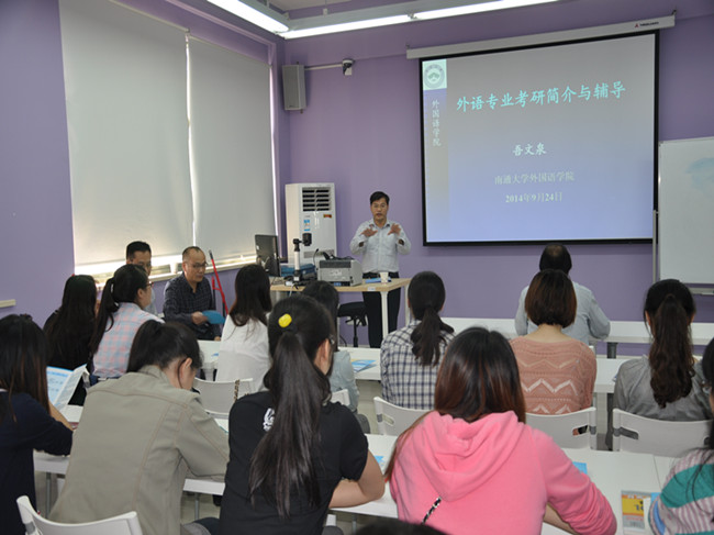 会上,薛荣院长介绍了学院10级学生考研和就业情况,鼓励本届考研学生继续努力,做好准备,积极备战即将到来的全国研究生入学考试。南通大学外国语学院院长吾文泉教授从多角度分析了今年研究生招录的形势,指出了今年研究生招录的政策变化,提醒同学们报考时要注意各院校的推免名额所占比例,做出理性选择。吾教授还就自己多年的研究生招录经验跟同学们做了深入交流,并介绍了本院的研究生招生情况。南通大学的相关专业老师也分别从英语语言学、英美文学等方面给同学们做了具体分析和指导,提出了科学有效的复习方法和规范的答题技巧,赢得同学们的阵阵掌声。