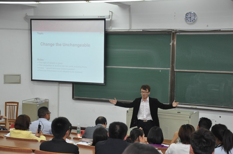 决赛由二个环节组成。第一环节为定题演讲,选手们根据主题阐述自己的观点。他们精彩的表现和流利的口语显示出较强的语言应用能力。第二部分为提问环节,面对外教不同角度的提问,选手们应对自如,敏捷的思维给评委留下了深刻的印象。选手们从容不迫,体现了较高的人文素养,赢得了观众的阵阵掌声。