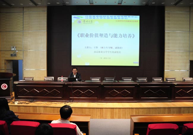 10月20日晚,由江苏省招生就业指导服务中心主办的2014年度就业公益巡讲在我校文彰楼报告厅举行。南京林业大学学生处王锋副处长作为巡讲教师,为我校2015届毕业生带来了《职业价值塑造与能力培养》专题讲座。