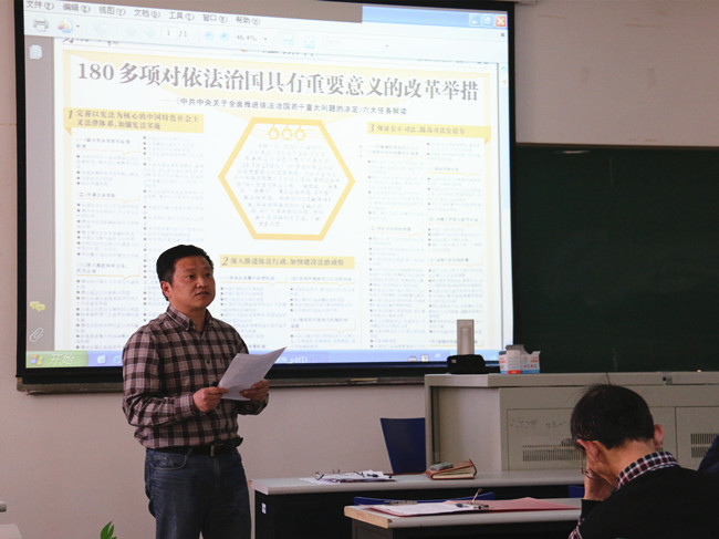党委书记王洪元以《光明日报》“180多项对依法治国具有重要意义的改革举措”报道为切入点,对中共十八届四中全会精神进行了详细解读。大家一致认为党的十八届四中全会对全面推进依法治国、建设法治中国具有里程碑意义,全会明确了全面依法治国的总目标,提出了全面推进依法治国的一系列新思想、新观点、新举措,为推进国家治理体系和治理能力现代化提供了法治基石和制度保障。