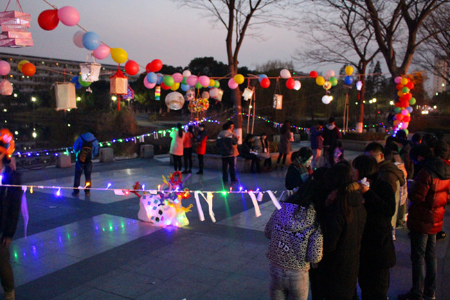 艺术学院学生选用身边简易可得的废旧材料,精心装饰,大胆创新,制作了各式各样的精美彩灯作品;同时搭配了数百条风格迥异、内容丰富的灯谜,融知识性与趣味性为一体。同学们踊跃参与、积极思考,所有灯谜被一抢而空,丰厚的奖品让大家沉浸在猜灯谜的乐趣钟。许愿墙上也记录了同学们对2015年满满的祝福与期望。