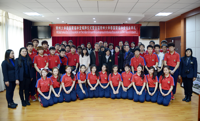 1月14日上午,常州大学泰国蒙福学堂首届学生结业典礼在我校国际教育交流学院多功能厅举行。泰国驻上海总领馆副总领事兰洛萍、泰国蒙福学校副校长耿甘达•孔塔威玲、常州大学党委书记史国栋出席典礼。来自泰国蒙福学校的34名学生和10名老师,我校国际教育交流学院、国际交流处等部门负责人及任课教师代表参加了结业典礼。