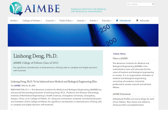 AIMBE是医学与生物工程领域的国际性学术组织,拥有会士约1500名,代表世界医学与生物工程领域的最杰出(Top 2%)学者,新当选会士必须由现任会士推荐,经两轮筛选,经全体会士投票选举产生。AIMBE会士不仅是世界生物医学工程领域的学术精英,也是该领域推动社会进步的倡导者、技术成长和进步的领导者,他们的卓越贡献对提高世界人民生活质量、延长寿命等重大问题以及相关公共卫生政策的制定产生了重要的影响。(编辑 郁涛)