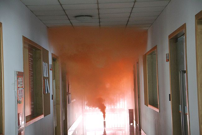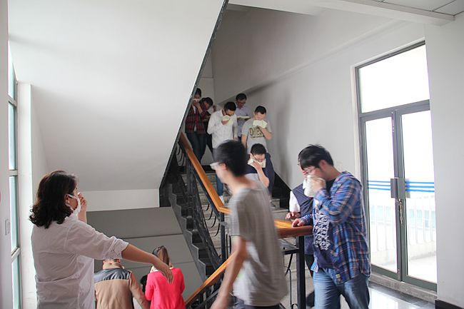 演习前,石油化工学院副院长罗士平利用石化中心大楼广播向师生强调本次消防演练注意事项。上午九点整,石油化工学院党委书记王车礼宣布消防演练正式开始,顿时火警声长鸣,一场声势浩大、紧张有序的消防疏散演练正式拉开帷幕:楼道内硝烟弥漫,师生们在工作人员的指挥下,按照火场逃生自救要点,用毛巾捂住口鼻,弯腰、紧贴墙根和楼梯扶手,有序疏散,快速撤离到石化中心大楼前空地上;师生在空地上集结完毕后,唐亮队长对本次消防疏散演练进行了点评,充分肯定了演练效果,同时也指出了在演练过程中存在的不足。