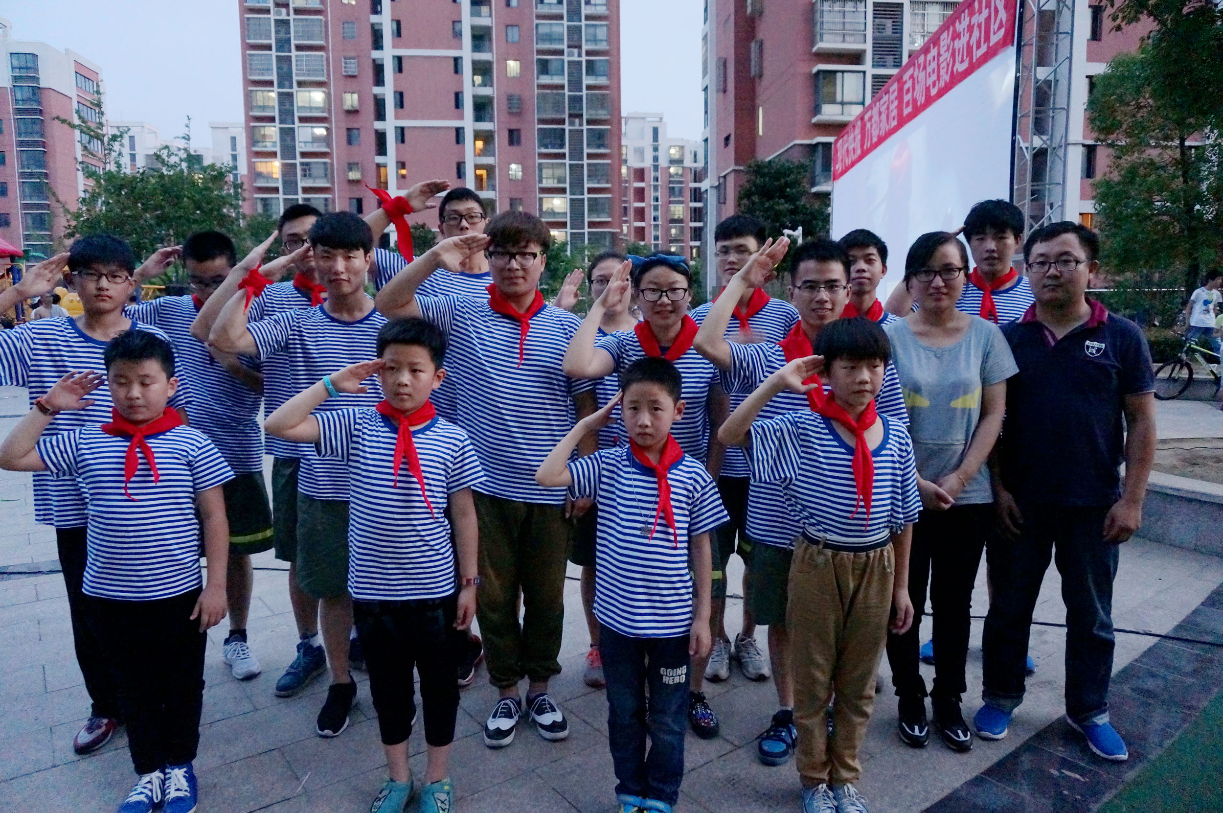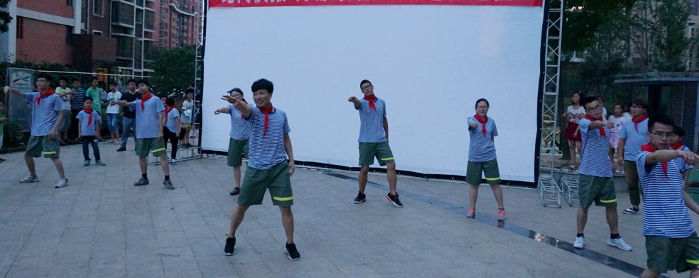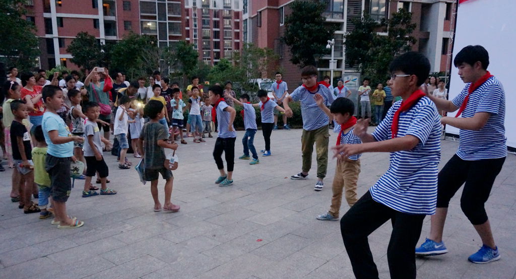 作为新北区第二届青少年公益项目创投大赛重点团队之一的首场“热身”,大学生和社区青少年在露天举行的红色电影展之际,用长达15分钟的青春舞蹈开场,跳出欢快的节奏,表达了纪念抗日战争胜利的“最爱国防绿”情怀。
