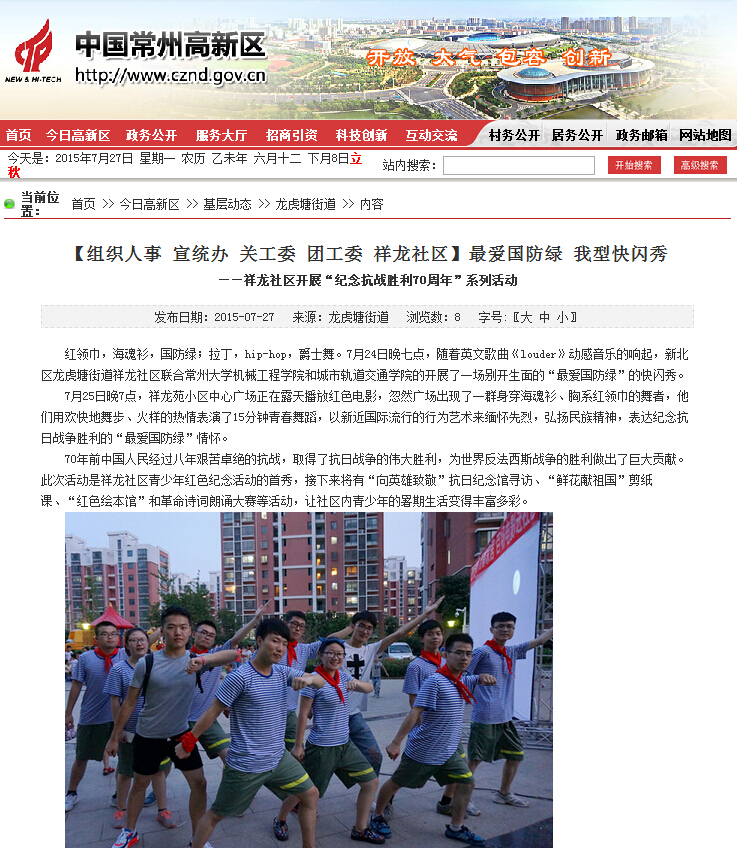 此次活动得到了新北区龙虎塘街道祥龙社区、常州市疯客舞步舞蹈教室大力支持。2015年是中国人民抗日战争暨世界反法西斯战争胜利70周年,常大学子选择在2015的暑假与祥龙社区的青少年进行一系列的红色纪念活动:“向英雄致敬”抗日纪念馆寻访、“鲜花献祖国”剪纸课、“红色绘本馆”筹建和革命诗词诵读等,形式多样,内容丰富,进一步宣传了中国人民的抗战精神和抗战胜利的伟大历史意义,增强青少年的民族自尊心和自豪感。