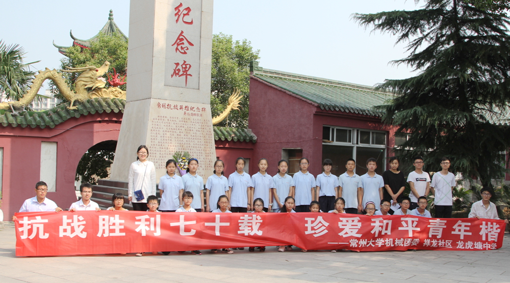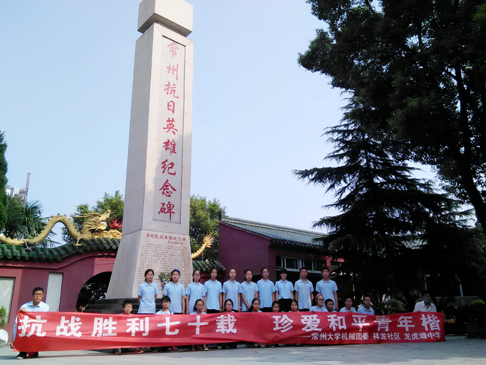 9月3日是中国人民抗日战争暨世界反法西斯战争胜利70周年纪念日,常州大学机械团委的大学生携手新北区龙虎塘街道祥龙社区及常州市龙虎塘中学在常州抗日英雄纪念馆内开展重温入团誓词活动,并参观纪念馆。