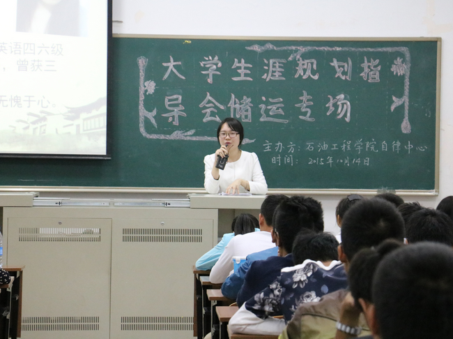 为提高15级新生对大学生活的总体认知,更好地规划四年的大学生涯,10月14日晚,石油工程学院2015级大学生涯规划指导会在南二阶举行2015级大学生涯规划指导会。
