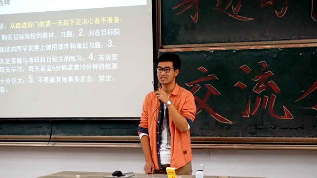本次活动的主题是寻找身边的榜样,分享经验。优秀学生代表在创新创业,学习,考研,社会工作等方面,向大一学子传授经验。其中,蔡正熙同学依据自身的经历分享了他的心得体会。他鼓励我们将想法付诸实践,利用人脉资源,用危机意识促进自己往前走;胡婧,史雪阳两位同学分别向我们传授了在微积分和英语四级方面的学习经验;沈黄君同学鼓励新生树立目标,积极参与比赛、科研项目和创业,不要安于现状;王嘉琦同学围绕考研,教我们认清自己的位置,在大一打好基础,追求更好的未来;齐正刚同学介绍了各种兼职活动以及在其中注意事项,鼓励我们合理规划学习生活。活动最后,大一的同学们踊跃提问,学长学姐们悉心解答,使此次交流会在轻松活跃的气氛中结束。