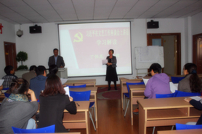 10月28日下午,艺术学院党委、工会、教工党支部组织教工在文彰楼402会议室组织学习了习近平总书记文艺工作座谈会重要讲话精神。图书馆馆长、“江苏理论宣讲先进个人”丁恒龙教授作习近平总书记讲话解读。