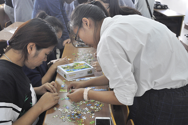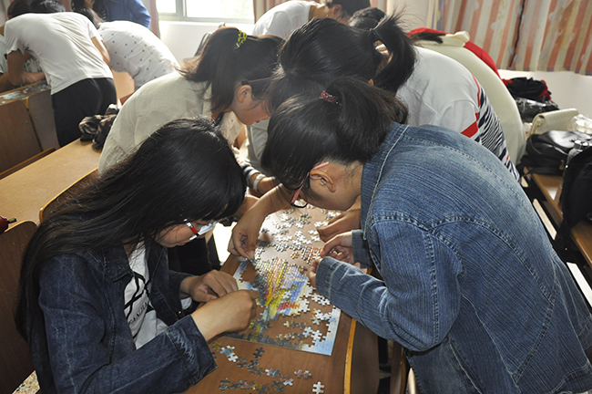 本次比赛要求参赛者以团队形式参加,每个团队在规定时间内要完成完成一张300块的拼图,期间主持人会加入一些智力趣题进行抢答。开始后,参赛选手迅速投入比赛之中,时间紧,任务重,考验着参赛者的信心和耐心。各团队成员分工合作,研究讨论,随着时间一分一秒的流逝,他们的参赛作品也渐渐露出了呈现于眼前,现场气氛更加紧张而热烈,比赛结束之余,各团队陆续完成了自己的拼图作品。最终,化工152班周凌云等同学组成的团队荣获第一名。
