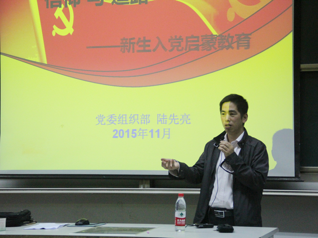 为了增强2015级新生对党的认识与了解,提高同学们的思想觉悟与政治素养,激发新生的入党积极性,11月5日,石油工程学院在南四阶举行2015级新生入党启蒙教育大会,邀请到校党委组织部陆先亮老师为新生作入党启蒙教育专题报告。该院15级全体新生聆听报告,会议由15级辅导员申锋老师主持。